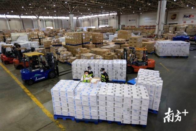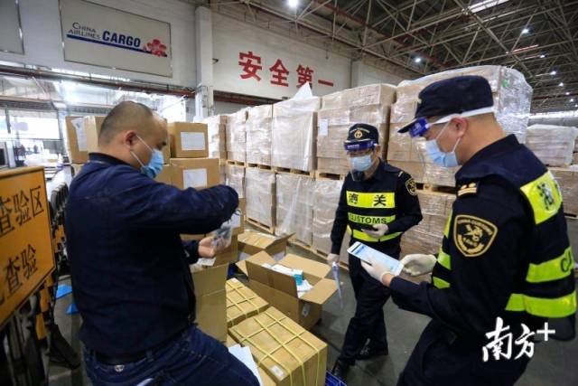深圳海關(guān)保障深圳向國際友好城市捐贈的抗擊疫情物資順暢通關(guān)。圖為海關(guān)人員正在檢查貨場防疫物資。南方日報(bào)記者朱洪波攝