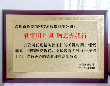 “君將明月佩,贈之光我行”,接收物資后,寶安區(qū)教育局為長盈精密公司贈送題詞牌匾,以表示對該公司在防疫關(guān)鍵時期慷慨解囊,支援教育系統(tǒng)抗擊疫情工作的感謝和敬意。