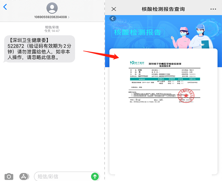 ④進(jìn)行短信驗(yàn)證后,即可查詢15天內(nèi)(從5月11日起)的核酸檢測(cè)報(bào)告