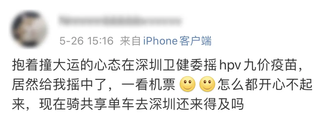 “嗚嗚嗚……簡直不敢相信我的眼睛,前段時間連口罩都抽不中的我,竟然抽中了九價HPV疫苗”。