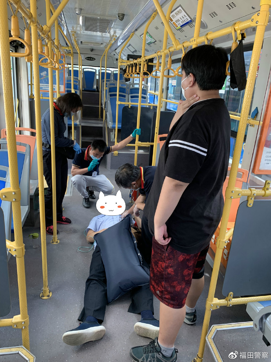 6月12日11時許,接到派出所報稱某站臺處公交車司機(jī)因胸口悶需要救助的指令后,巡邏民警迅速趕到現(xiàn)場。到達(dá)現(xiàn)場時,民警見司機(jī)躺在公交車的地上,于是立刻協(xié)助120醫(yī)務(wù)人員實(shí)施緊急救助,并將司機(jī)抬上救護(hù)車,由120醫(yī)務(wù)人員送往醫(yī)院。兩名輔警則留下看管公交車,確保其安全,直至巴士公司交接人把車開走。