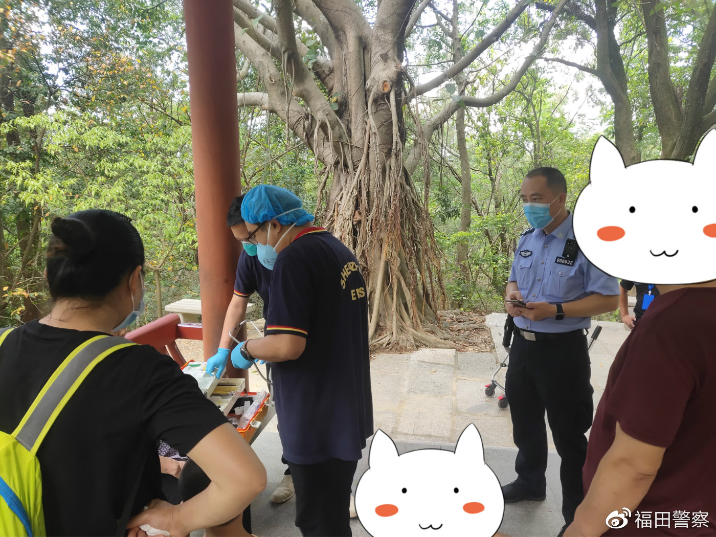 13時許,接派出所前臺指令,報稱一老人身體不適請求幫助后,民警立即趕到現(xiàn)場,協(xié)助120醫(yī)務(wù)人員進(jìn)行檢查。檢查完畢后,民警為老人遞上一杯水,并在確認(rèn)老人身體無礙后,將其護(hù)送下山。