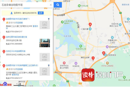28日上午,記者通過登錄深圳圖書館街區(qū)自助圖書館查詢發(fā)現(xiàn),目前寶安區(qū)可以預借取書的公共服務點共有25個,其中石巖街道無服務點。而通過百度搜索,之前設置的石巖艾美特廠服務點和同富康工業(yè)區(qū)服務點顯示暫停開放。
