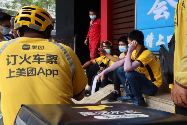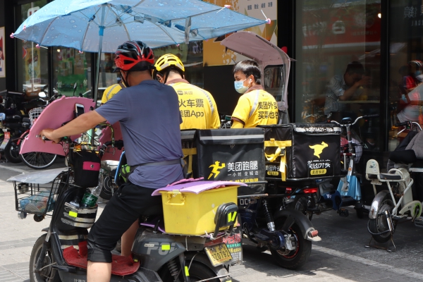 記者看到,街道上像呂先生這樣的外賣員數(shù)量不在少數(shù),短短十幾分鐘,記者就看到了近百名外賣員、派送員穿行街頭,將訂單送達客戶手中。他們趁取餐時間,在餐廳門口休息,不少人直接席地而坐,享受一下開放餐廳流出的一絲冷氣。