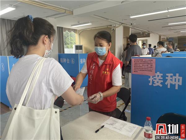 在新冠疫苗布心市場臨時接種點,前來接種的市民有序排隊,來自社區(qū)的工作人員和義工在各自的崗位上做好指引工作,引導市民了解疫苗接種的詳情和注意事項,并幫助他們在手機上提前進行了信息預登記,耐心為市民答疑解惑。65歲的義工成寶梅是一名深圳市五星級義工,此刻的她正在接種區(qū)域引導市民去接種臺,從早上九點到下午六點,她就這么一直站在崗位上,精神抖擻,笑臉迎人,絲毫不感覺累。成寶梅說道,“這個歲數(shù)了還能為這個社會發(fā)揮一些余熱,這是很有意義的一件事情,能聽到別人說的一聲謝謝,感覺什么都值得了。”