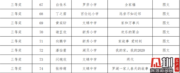 6月1日,羅湖區(qū)“家庭文明公益廣告”及“我家年度故事”征集活動(dòng)獲獎(jiǎng)名單公布,其中,18個(gè)“家庭文明公益廣告”和74個(gè)“年度故事”圖文作品獲獎(jiǎng)。