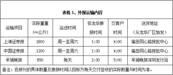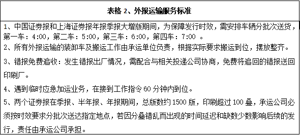 深圳報(bào)業(yè)集團(tuán)印務(wù)有限公司現(xiàn)承印外報(bào)主要有上海證券報(bào)、中國證券報(bào)、羊城晚報(bào)等重要報(bào)刊,根據(jù)各報(bào)刊的具體要求,安全、準(zhǔn)時(shí)、保質(zhì)、保量地運(yùn)送每天生產(chǎn)發(fā)行數(shù)量的各報(bào)刊到指定地點(diǎn)或客戶手中,具體運(yùn)輸發(fā)行內(nèi)容和標(biāo)準(zhǔn)詳見下面表格。