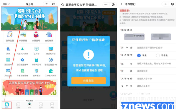 學生及家長可通過“深分類”小程序首頁主題活動入口進入活動。在參與活動之前,學生所在學校需開通環(huán)保銀行支行,學生需注冊所在學校支行的環(huán)保銀行賬戶,并在活動中進行賬戶信息綁定、上傳參與學生照片才可參與后續(xù)打卡集贊活動。