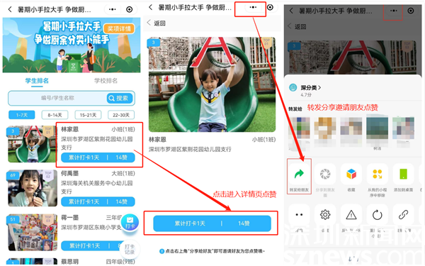 活動期間,學生需在活動頁上傳廚余垃圾分出和個人廚余垃圾投放共2張照片完成當日打卡;同時,在排行頁面可搜索進入本人頁面進行點贊,分享個人頁面至微信群和好友進行集贊等;每個用戶每天擁有5次點贊機會,每天僅可為一位用戶點贊一次。