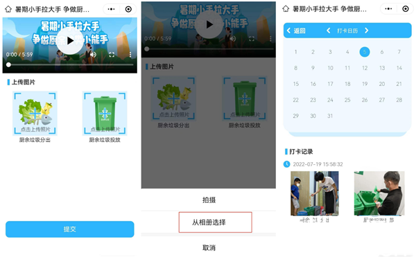 需要注意的是,學生在上傳照片時,須上傳每日廚余分類和廚余投放照片,不可重復使用同一張照片進行打卡,當日多次上傳照片僅記錄打卡簽到1次;此外,如上傳與廚余垃圾分類無關(guān)的照片,系統(tǒng)將自動作廢當次打卡,判定該次打卡無效。