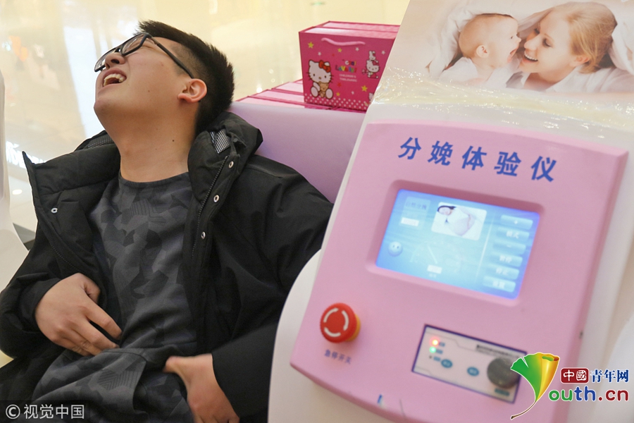2018年3月8日,一名男士在山東煙臺(tái)大悅城通過(guò)“分娩體驗(yàn)儀”感受“分娩”時(shí)的陣痛。
