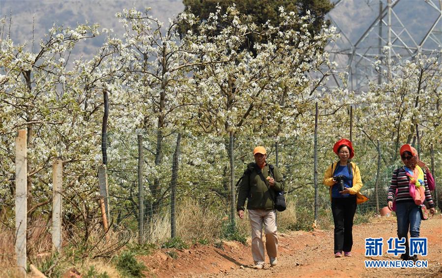 這是幾名游客在云南昆明呈貢萬溪沖的梨園里(3月21日攝)。近期以來,云南多地的梨花相繼開放。梨花、村莊、民居、游人相映成趣,構(gòu)成了一幅幅美麗的“大地春歌”圖。新華社記者 藺以光攝