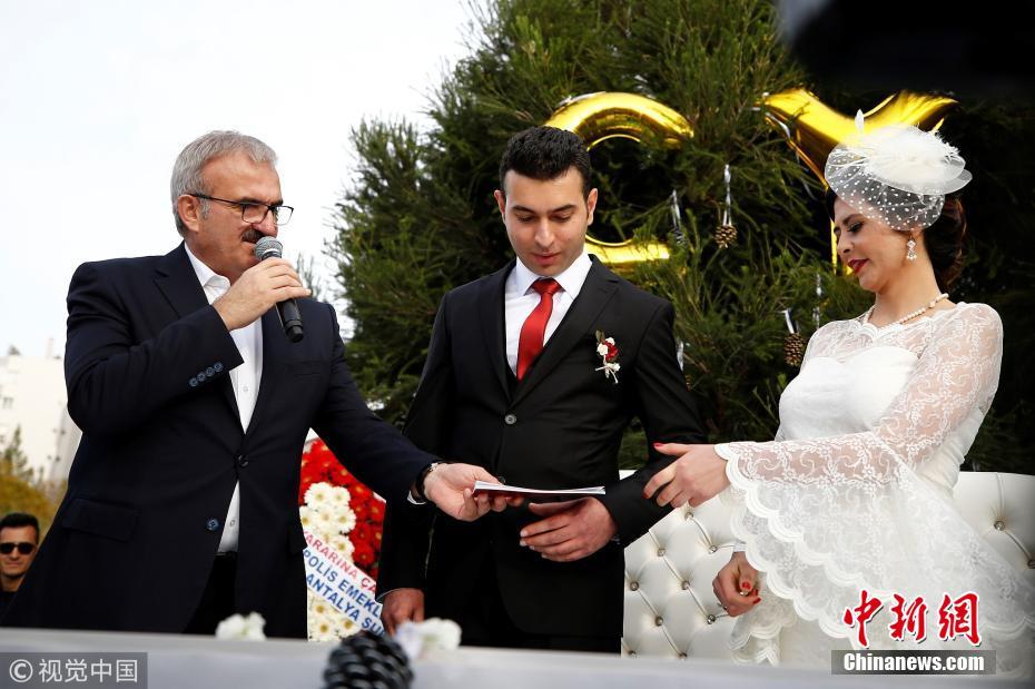 當地時間2018年3月21日,土耳其安塔利亞,警官Ceren Ekici和Taha YasinGul舉行婚禮。在10個月前的一次行動中,Taha YasinGul不慎開槍擊中Ceren Ekici的頭部,所幸沒有造成生命危險。他們的婚禮由警局同事操辦,同事們舉著防彈盾牌,護送這對新人走向禮臺。圖片來源:視覺中國