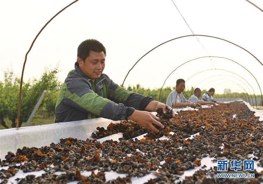 5月20日,河北省辛集市田家莊鄉(xiāng)東張口村農民在晾曬采收的木耳。