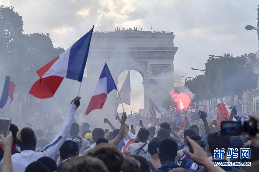 7月15日,法國球迷在巴黎香榭麗舍大街上慶祝法國隊(duì)奪冠。