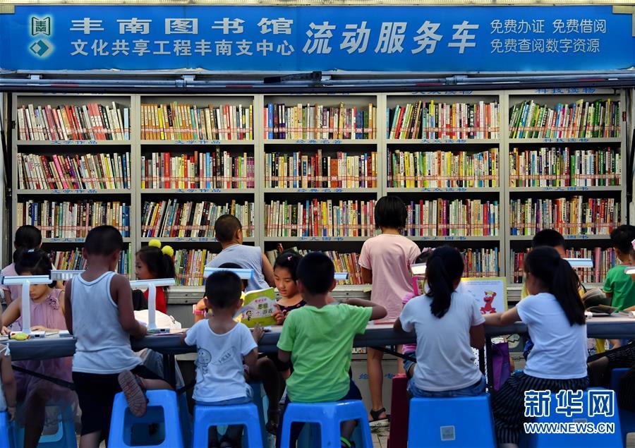 7月16日,唐山市豐南區(qū)金都花園社區(qū)的小朋友在流動(dòng)服務(wù)車(chē)前翻閱圖書(shū)。新華社記者 楊世堯攝