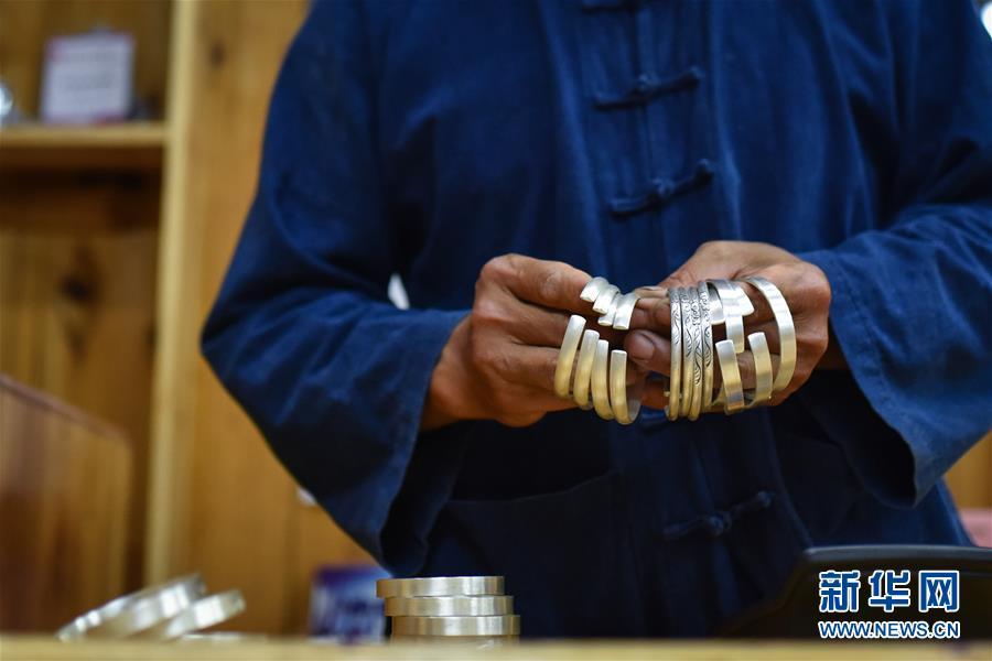 8月3日,銀匠龍懂陽(yáng)在銀飾店內(nèi)清點(diǎn)制作完成的銀質(zhì)手鐲。