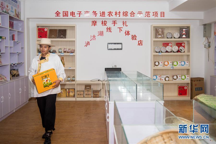 摩梭青年次里打史在寧蒗永寧鄉(xiāng)落水村的電子商務體驗店里整理商品(7月31日攝)。 新華社記者 胡超 攝