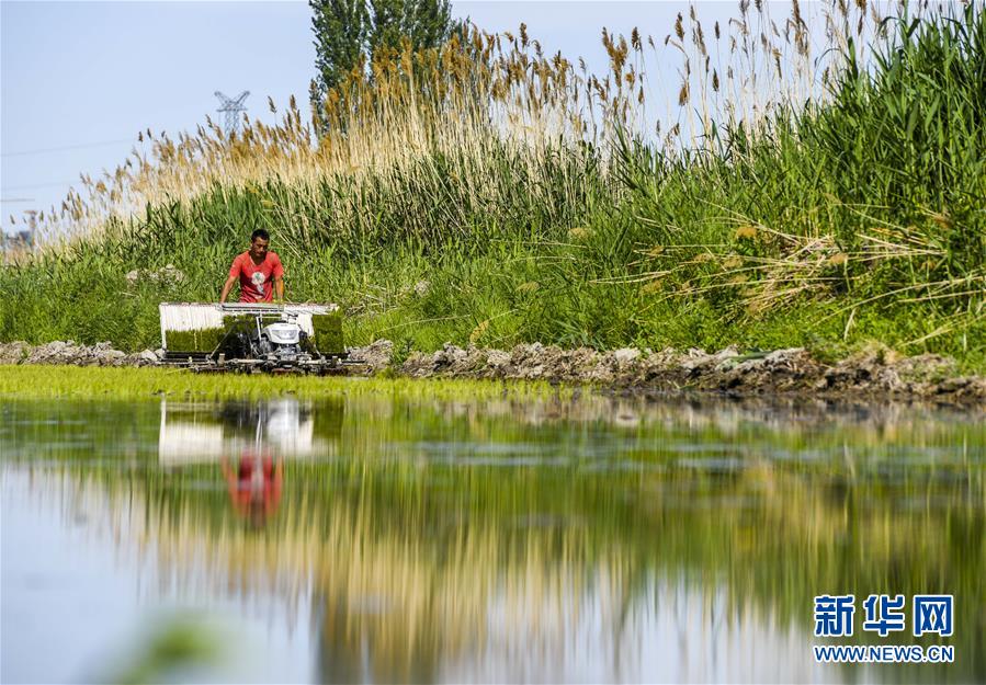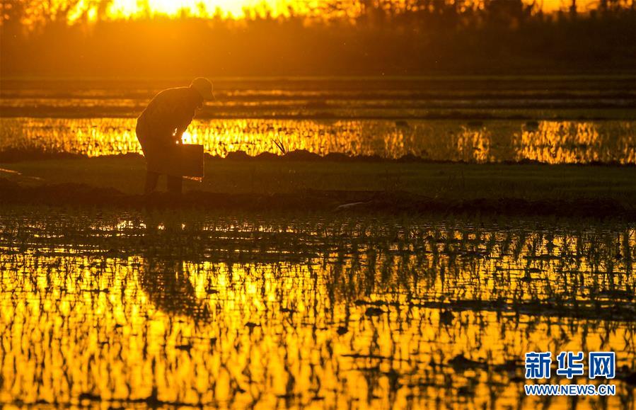 夕陽西下,村民在新疆察布查爾錫伯自治縣種羊場托海依村的一處農(nóng)田里勞動(5月21日攝)。近日,隨著氣溫漸高,地處新疆伊犁河谷的察布查爾錫伯自治縣迎來插秧高峰期,田間地頭一派繁忙景象。塊塊稻田水滿如鏡,田間防護林枝繁葉茂,遠處雪山依稀可見,如一幅在大地上鋪展開的生態(tài)畫卷。新華社記者胡虎虎 攝