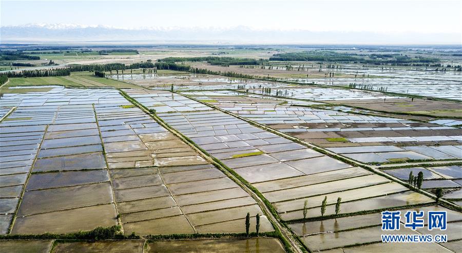 在新疆察布查爾錫伯自治縣種羊場托海依村拍攝的一處農(nóng)田,秧苗與遠處的雪山相映成趣(5月21日攝)。近日,隨著氣溫漸高,地處新疆伊犁河谷的察布查爾錫伯自治縣迎來插秧高峰期,田間地頭一派繁忙景象。塊塊稻田水滿如鏡,田間防護林枝繁葉茂,遠處雪山依稀可見,如一幅在大地上鋪展開的生態(tài)畫卷。新華社記者胡虎虎 攝