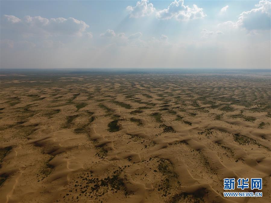 內(nèi)蒙古杭錦旗沙日召嘎查牧民白音道爾計(jì)治理過的庫布其沙漠(7月31日無人機(jī)拍攝)。 新華社記者邢廣利攝