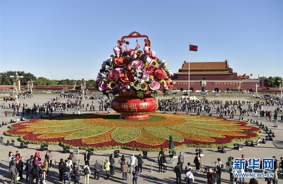 當日,“祝福祖國”巨型花籃在北京天安門廣場全面亮相。據(jù)了解,從2011年開始,“祝福祖國”巨型花籃一直作為天安門廣場中心花壇的主景在國慶節(jié)期間向祖國獻禮。今年花籃內(nèi)布置有紅掌、梅花、康乃馨、向日葵、蘭花、月季等多種仿真花卉,寓意幸福吉祥。 新華社記者 李賀 攝