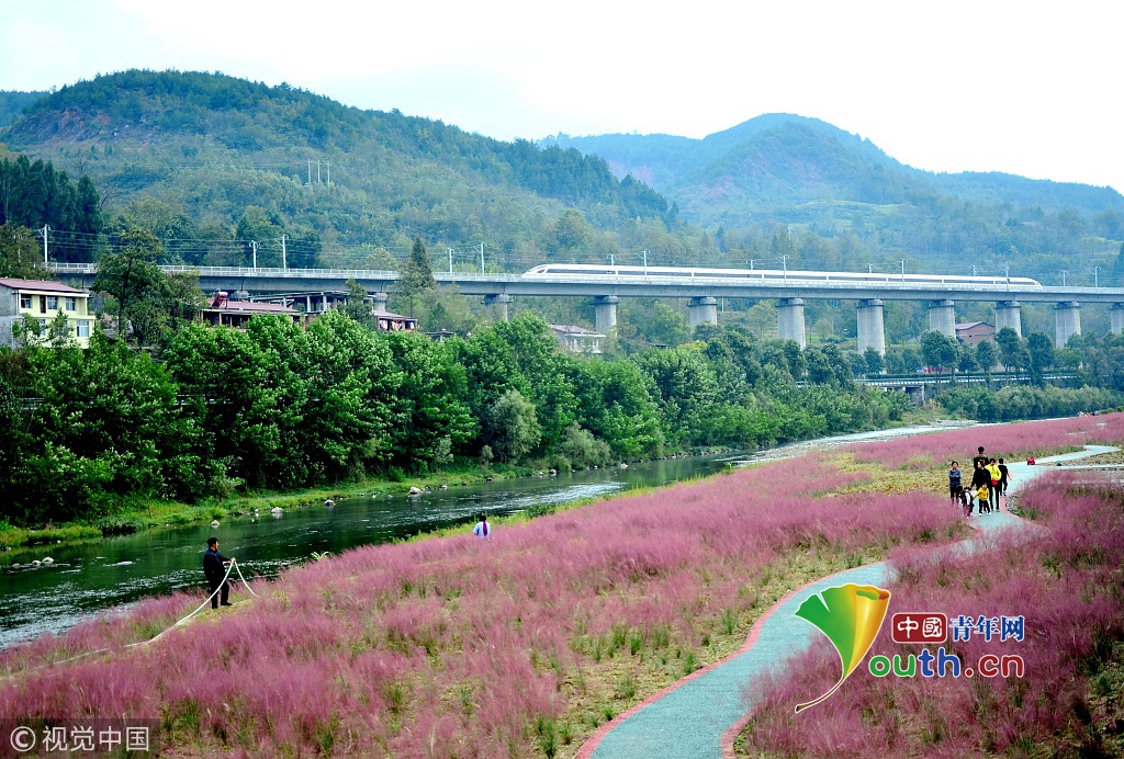 2018年10月14日,陜西漢中,西成高鐵漢中市寧強(qiáng)縣高寨子路段上的一列動(dòng)車正從紅艷艷的蘆葦花海附近駛過(guò)。