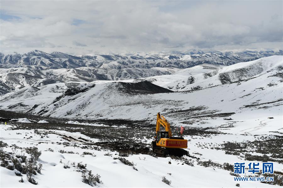 工作人員駕駛大型機械在昌都市江達(dá)縣的高山牧場上搶通道路(10月14日攝)。新華社記者 劉東君 攝