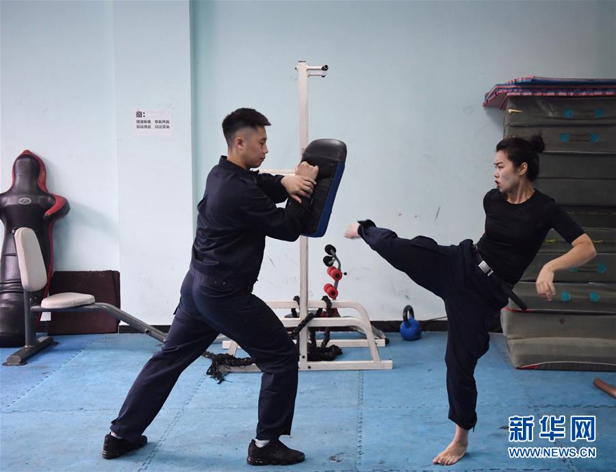 10月16日,湯春燕在健身房內(nèi)進(jìn)行擒敵訓(xùn)練。 新華社記者王全超攝