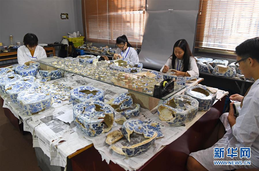 10月18日,在江西景德鎮(zhèn),工作人員修復(fù)明代瓷枕。