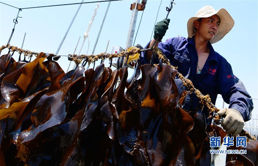 5月17日,在霞浦縣沙江鎮(zhèn)沙江村碼頭,養(yǎng)殖戶在晾曬海帶。