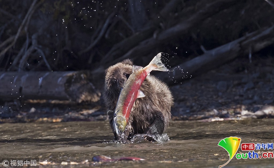 2018年10月29日訊(具體拍攝時(shí)間不詳),加拿大英屬哥倫比亞,一只15個(gè)月大的棕熊幼崽在Chilko Lake湖畔成功捉到一只4公斤重的紅色鮭魚。
