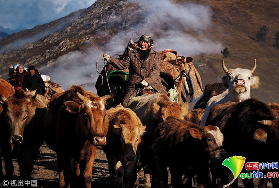 族牧民整理好行裹,抱著孩子,趕著牛羊,浩浩蕩蕩向秋牧場遷徙。