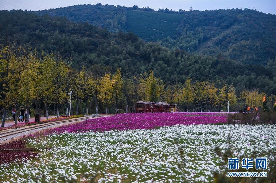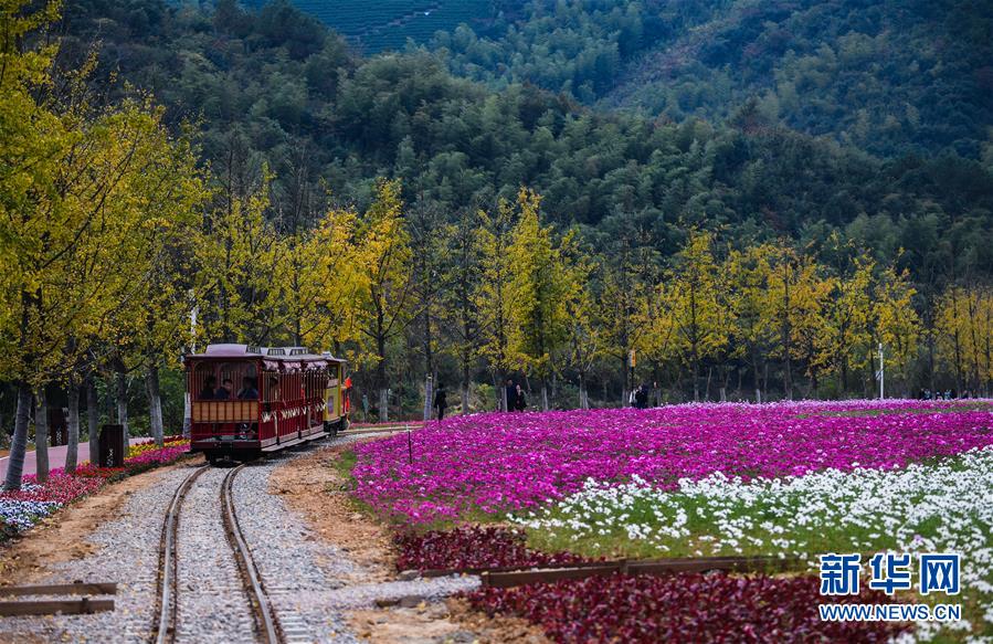 11月2日,游客乘坐觀光小火車觀賞“五彩花?!保o(wú)人機(jī)拍攝)。