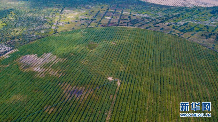 內(nèi)蒙古杭錦旗沙日召嘎查牧民白音道爾計(jì)種植的甘草等沙生植物(7月31日無(wú)人機(jī)拍攝)。 新華社記者劉磊攝