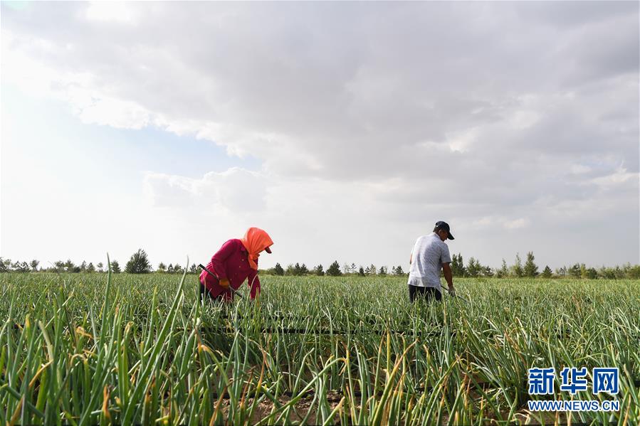 工人在內(nèi)蒙古鄂爾多斯市杭錦旗阿木古龍產(chǎn)業(yè)園區(qū)為蔬菜除草(8月1日攝)。該地示范發(fā)展沙漠節(jié)水現(xiàn)代農(nóng)業(yè),增加了農(nóng)牧民收入。