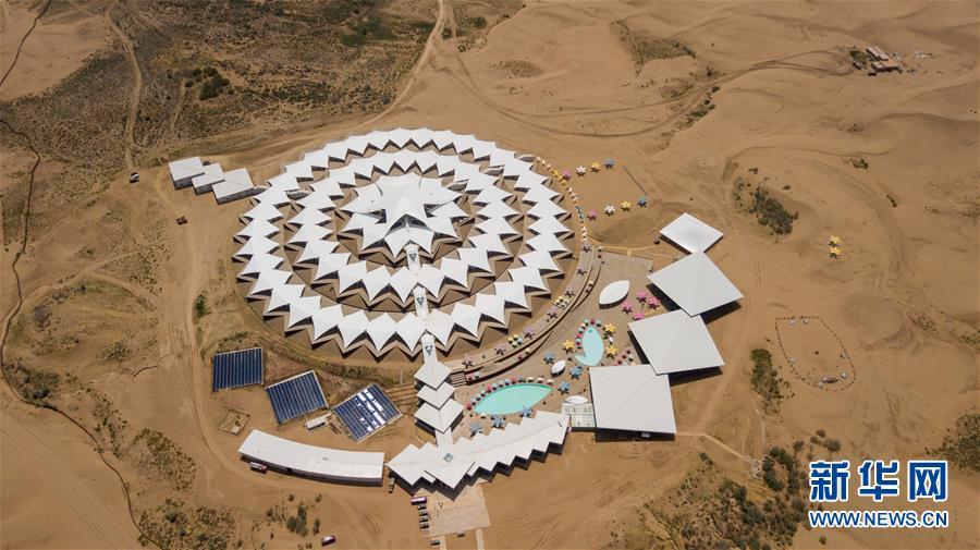 位于內(nèi)蒙古杭錦旗的七星湖沙漠酒店(8月1日無(wú)人機(jī)拍攝)。 新華社記者邢廣利攝