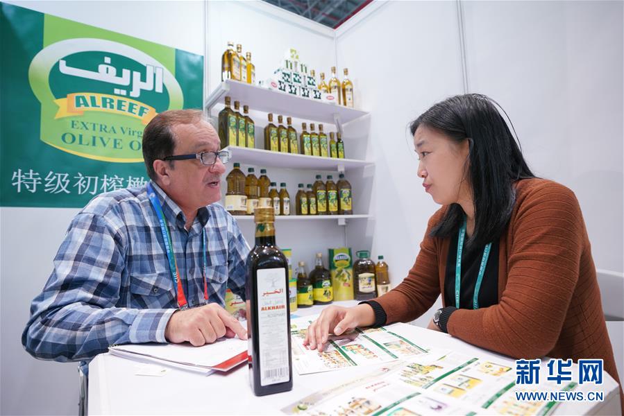 11月6日,敘利亞橄欖油經(jīng)銷商胡薩姆(左)介紹橄欖油產(chǎn)品。 新華社記者 孟鼎博 攝