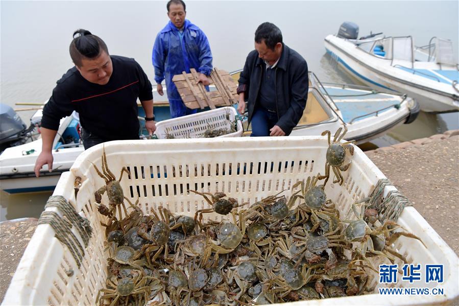 11月6日,在江西省南昌市進(jìn)賢縣軍山湖大閘蟹養(yǎng)殖水域,當(dāng)?shù)厮a(chǎn)養(yǎng)殖公司的工作人員將捕撈的大閘蟹搬運(yùn)上岸。 新華社記者彭昭之?dāng)z