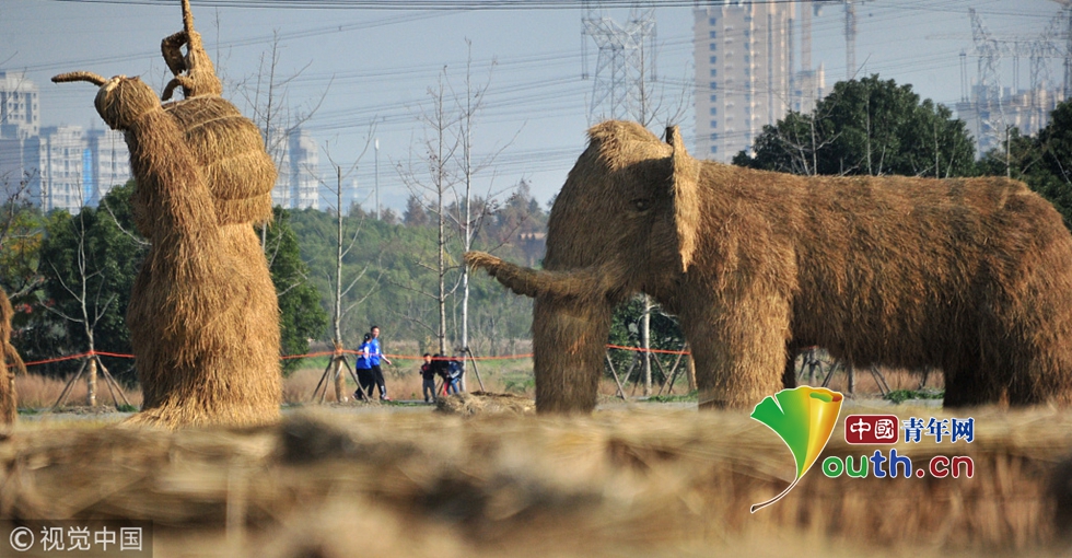據(jù)悉,原本收割過(guò)的早稻由于不能焚燒,會(huì)直接粉碎入田。如今這些早稻的秸稈被搭成了景觀雕塑,也成了一道廢物利用的特色風(fēng)景。圖片來(lái)源視覺中國(guó)