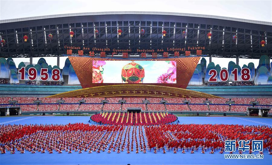 12月10日,廣西壯族自治區(qū)成立60周年慶祝大會在廣西體育中心隆重舉行。這是慶祝大會上的群眾文藝表演。 新華社記者 李學(xué)仁 攝