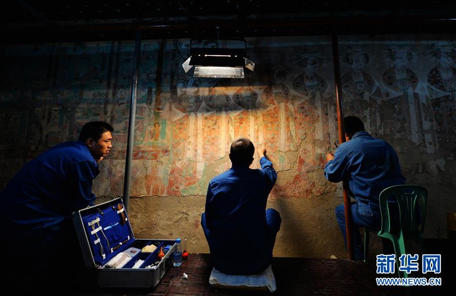 技術人員在莫高窟內對病害壁畫進行修復(2014年9月3日攝)。 敦煌記錄歷史。開放的胸襟,曾讓這里成為古代絲綢之路上“華戎所交一都會”。 時隔千年,改革開放的春風吹入西北內陸小城,敦煌再度成為中國對外開放的文化前沿。 新華社記者 陳斌 攝