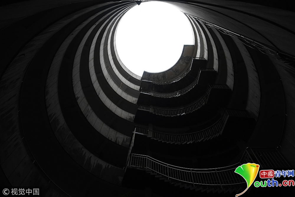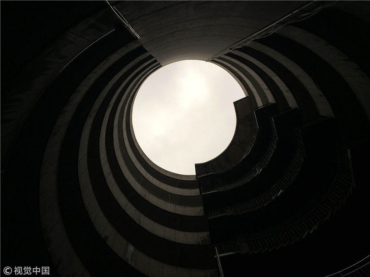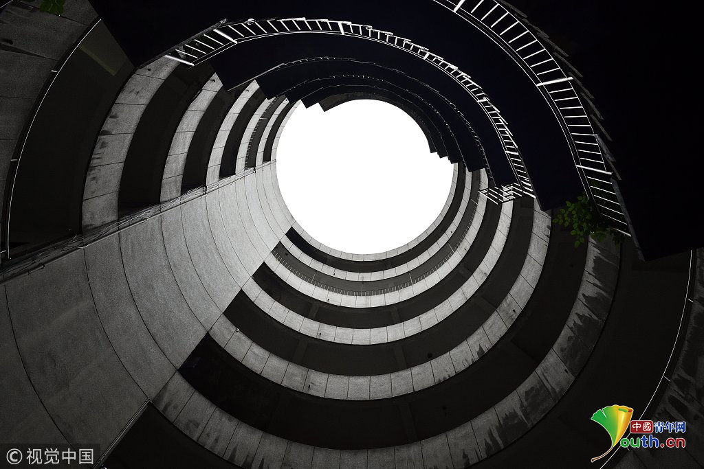 2017年9月27日,重慶,南岸區(qū)某小區(qū)的“螺旋”停車場,從公路到車庫要下5層樓,司機(jī)需要轉(zhuǎn)無數(shù)個360度圈。圖片來源:視覺中國