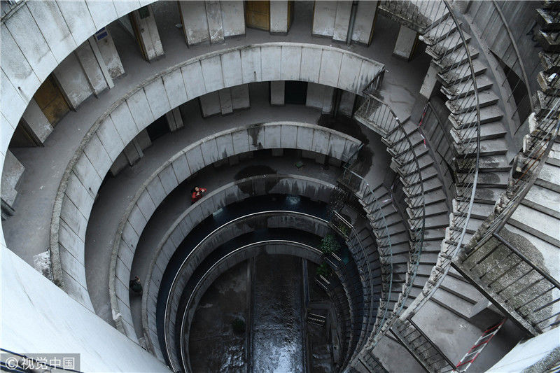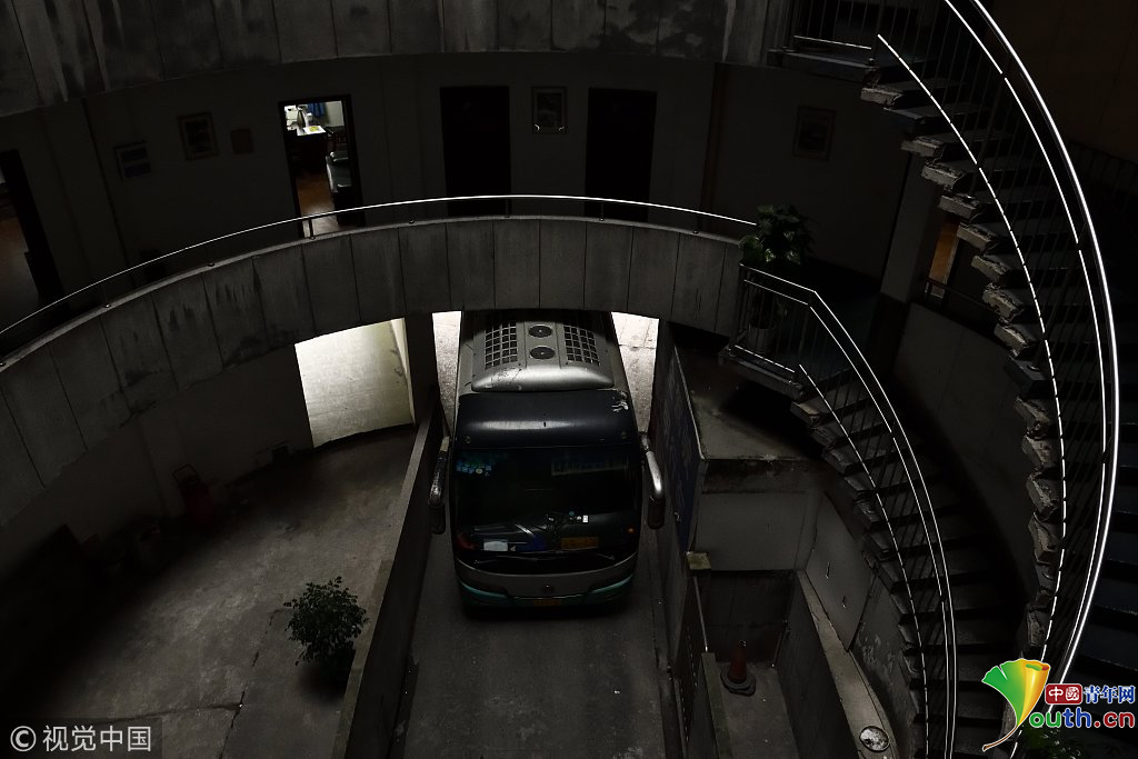 2018年12月6日,重慶江北紅旗河溝汽車站內(nèi),有一棟獨(dú)特的八層圓環(huán)狀建筑,底層每天有不少進(jìn)出站的客車通行。據(jù)悉,這棟樓建于1990年,曾經(jīng)是車站旅館,如今一、二兩層用于車站辦公,其余樓層已廢棄。為確保安全,三層以上已經(jīng)被封鎖。圖為公交車穿過8層空心圓筒樓。徐勇/視覺中國