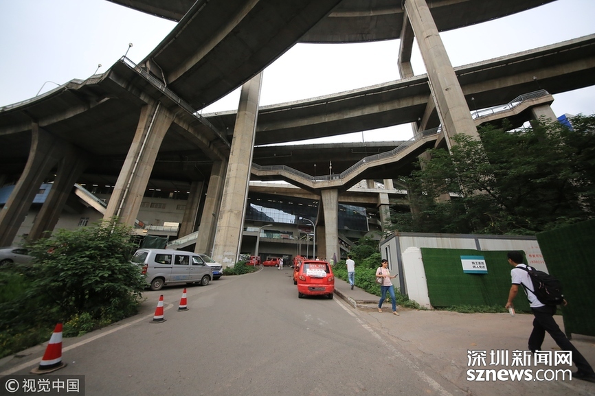 2018年5月29日,重慶,魔幻重慶又雙叒叕放大招!還有一個獨(dú)特的亮點(diǎn),重慶軌道交通3號線銅元局站,出口由一段長梯銜接上方立交橋和下方的路面,與全國最高城市立交橋蘇家壩立交組成了獨(dú)特風(fēng)景,許多游客專門趕來拍照。