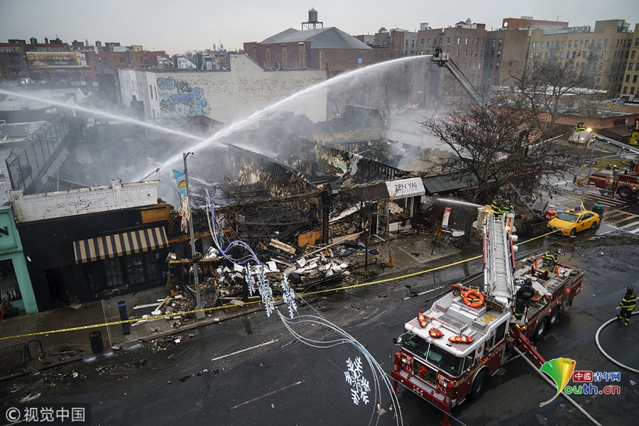 美國紐約發(fā)生大火吞噬六家商鋪 消防員撲滅火災余燼