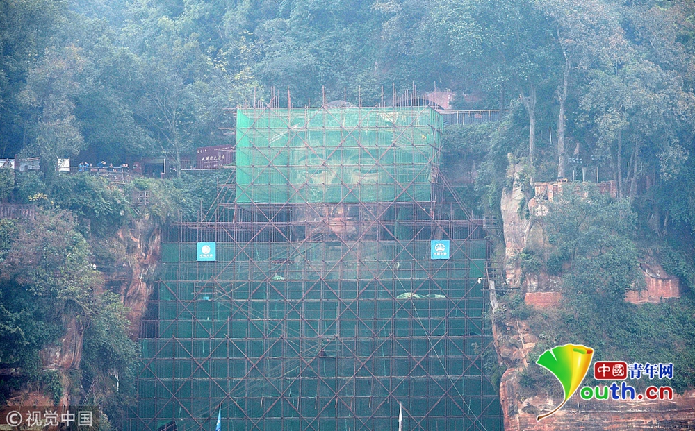 12月13日,四川樂山大佛周圍搭建腳手架已經(jīng)到達(dá)大佛頭部,10多名工人穿梭于搭建的腳手架之間,工人用綠色防護(hù)網(wǎng)繞腳手架將大佛圍住。從2018年10月8日截至今日,經(jīng)過66天的緊張施工,用了近兩千根6米長鋼管搭建腳手架,搭建的腳手架總重量達(dá)45噸,鋼管的總長度加起來達(dá)到11700米,而圍在腳手架外的防護(hù)網(wǎng)則使用了2000平方米左右。目前,包括頭部在內(nèi)的樂山大佛本體已被全部遮蔽。