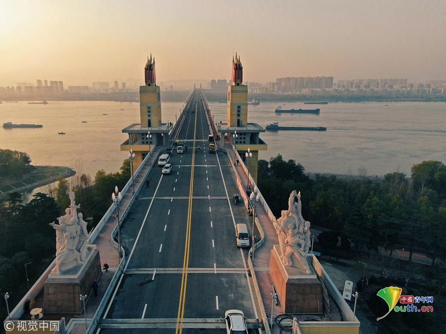 2017年9月19日,南京長江大橋正橋的混凝土面板已經(jīng)全部拆除,僅剩交錯(cuò)縱橫的鋼桁架橫跨在長江之上,從高空俯瞰猶如一條“鋼鐵巨龍”。
