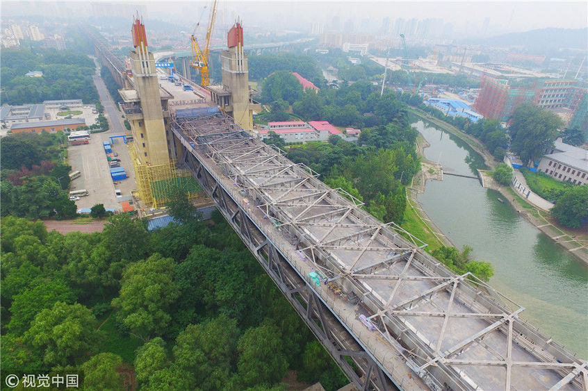 9月7日無人機(jī)拍攝的鄭北大橋鋼梁頂推施工現(xiàn)場。當(dāng)日,跨越鄭州北站的鄭北大橋鋼梁頂推成功。鄭北大橋是東西走向的鄭州市農(nóng)業(yè)路快速通道工程的一部分,需跨越鄭州北站。由于列車不能中斷運(yùn)行,鄭北大橋不能采用常見的搭腳手架方式施工,而是采用頂推法,即在大橋一端把橋身拼接好,然后一段一段朝著鐵路編組站上方送過去,最終完成橋梁架設(shè)。新華社記者朱祥攝