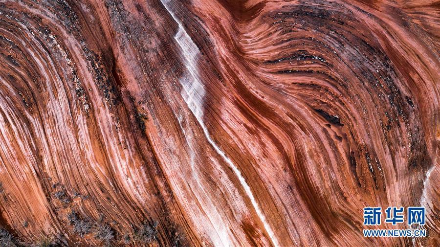 2018年10月21日在陜西省延安市安塞區(qū)坪橋鎮(zhèn)航拍的王家灣丹霞地貌。 大地之色,俯仰之間;壯美山河,是我的祖國。2018年,新華社記者操縱無人機“飛閱”華夏大地,在最美的時節(jié),定格下她的色彩斑斕。 新華社記者 陶明 攝